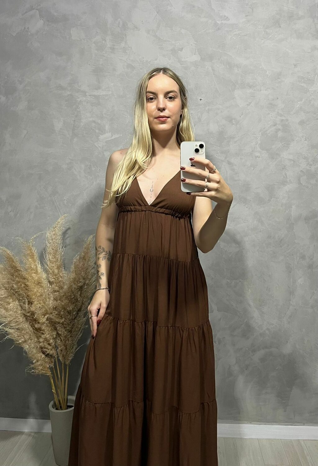 Vestido longo com caimento fluido e sofisticado. Apresenta decote V que valoriza o colo de forma delicada e feminina. O detalhe das costas abertas confere um toque sensual e moderno, ideal para quem busca um visual marcante. Possui alças finas reguláveis e cordão com amarração nas costas, permitindo ajustá-lo conforme desejar. Confeccionado em tecido leve e de toque macio, o vestido possui modelagem solta, com camadas que garantem movimento e charme extra à peça. Ideal para produções casuais com rasteiras ou para composições mais elaboradas com acessórios e salto.